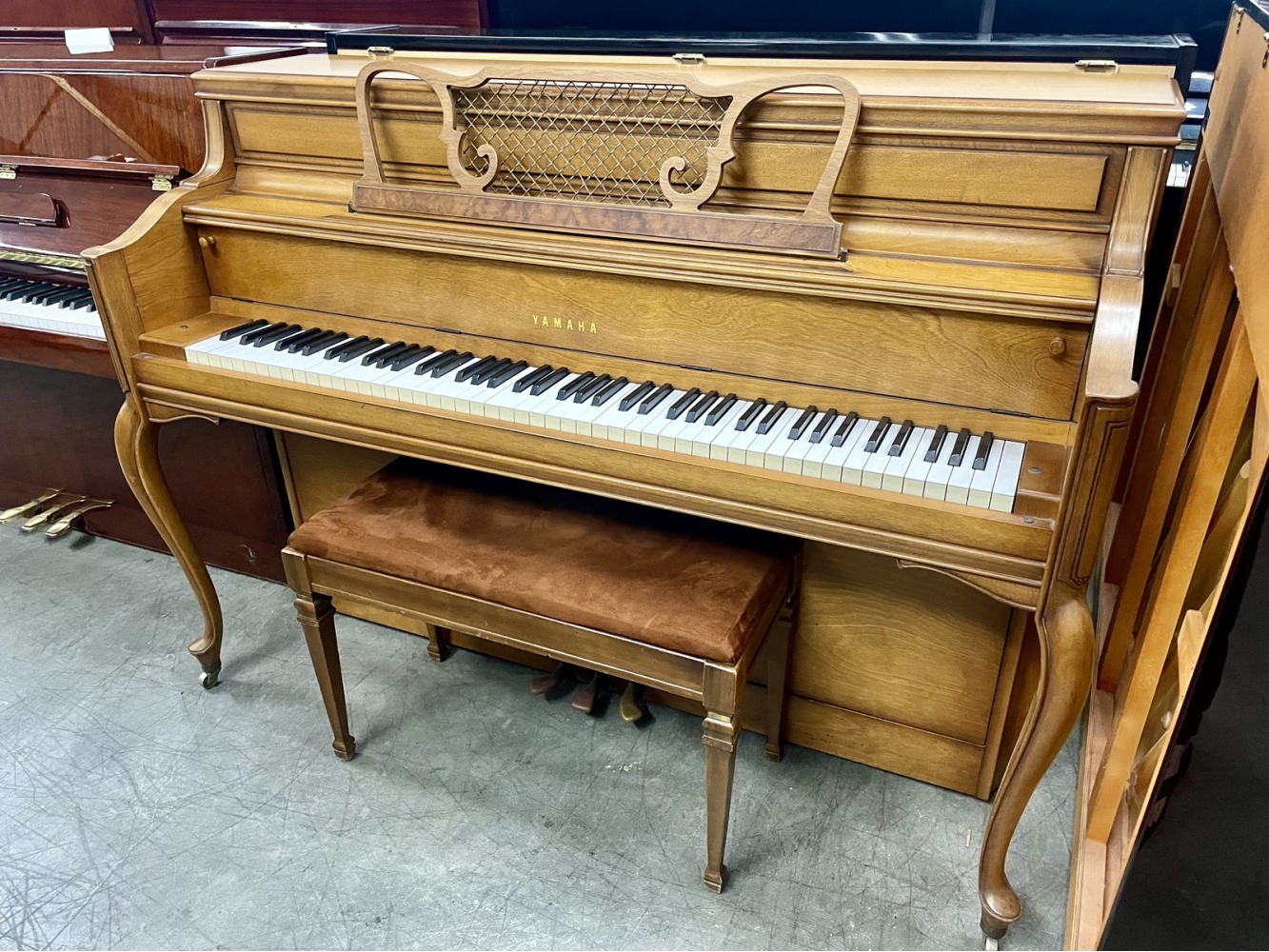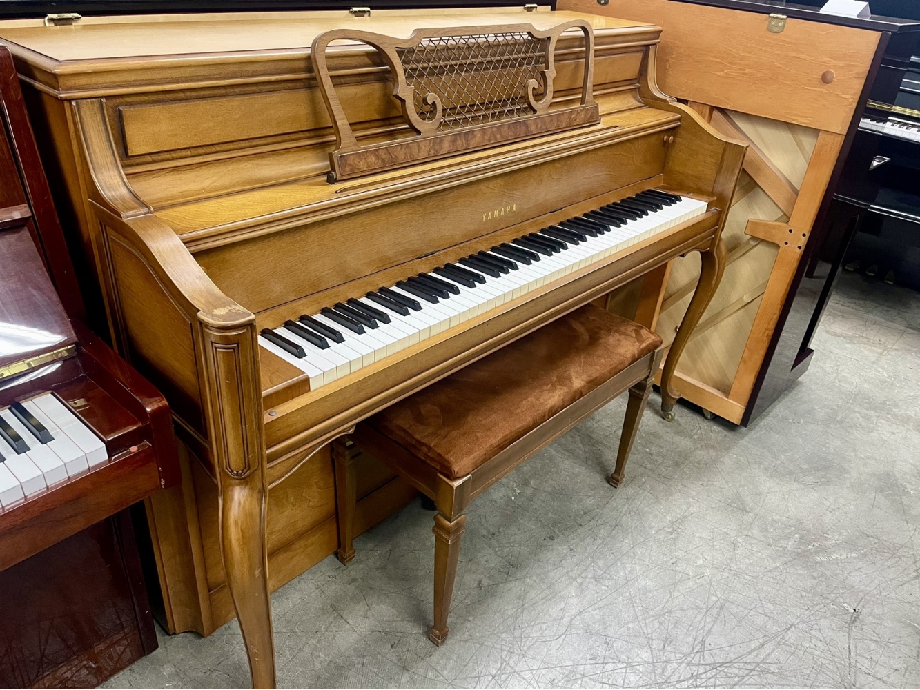 Beautiful Yamaha French Provincial Upright Piano. This piano features a gorgeous satin walnut finish. It has a lovely brighter tone and excellent touch. The console style is highly-popular among musicians and homeowners for its compact size and excellent sound. It features lovely French Provincial-style legs. This is an excellent deal on an excellent Yamaha console piano!