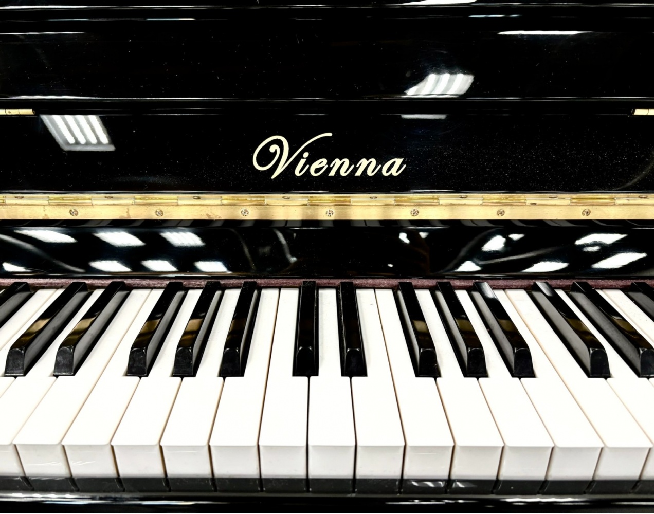 Gorgeous Vienna Console Upright Piano. This piano features a beautiful polished ebony finish. The console size is highly popular among musicians for its fuller tone and higher quality, while fitting very well in smaller homes and spaces. This piano is sure to look great in your home!