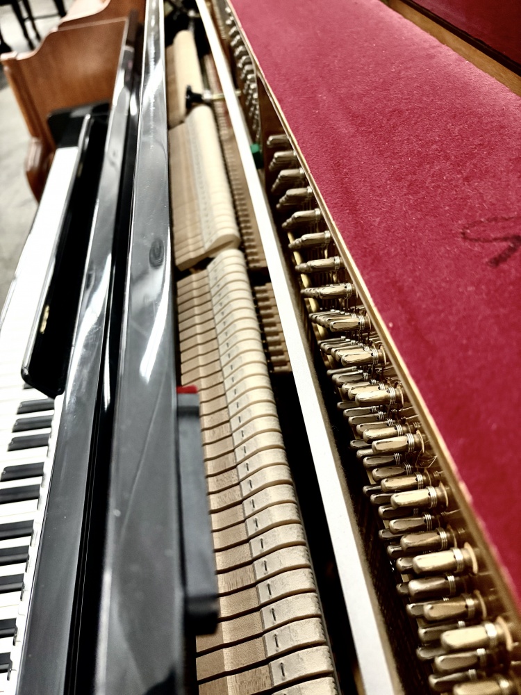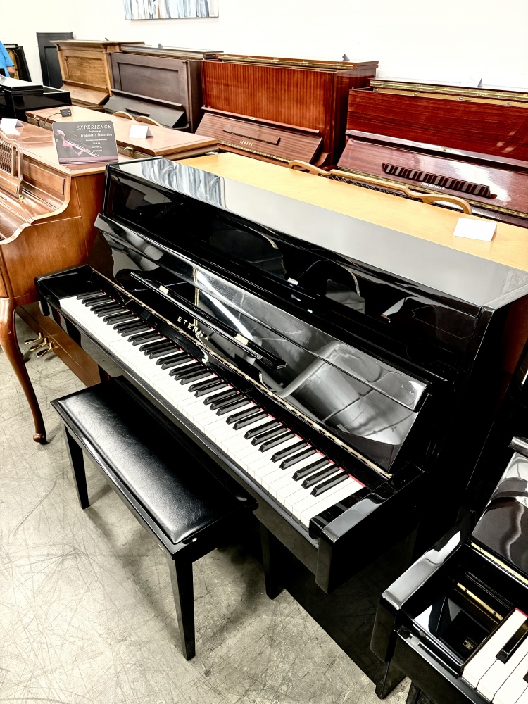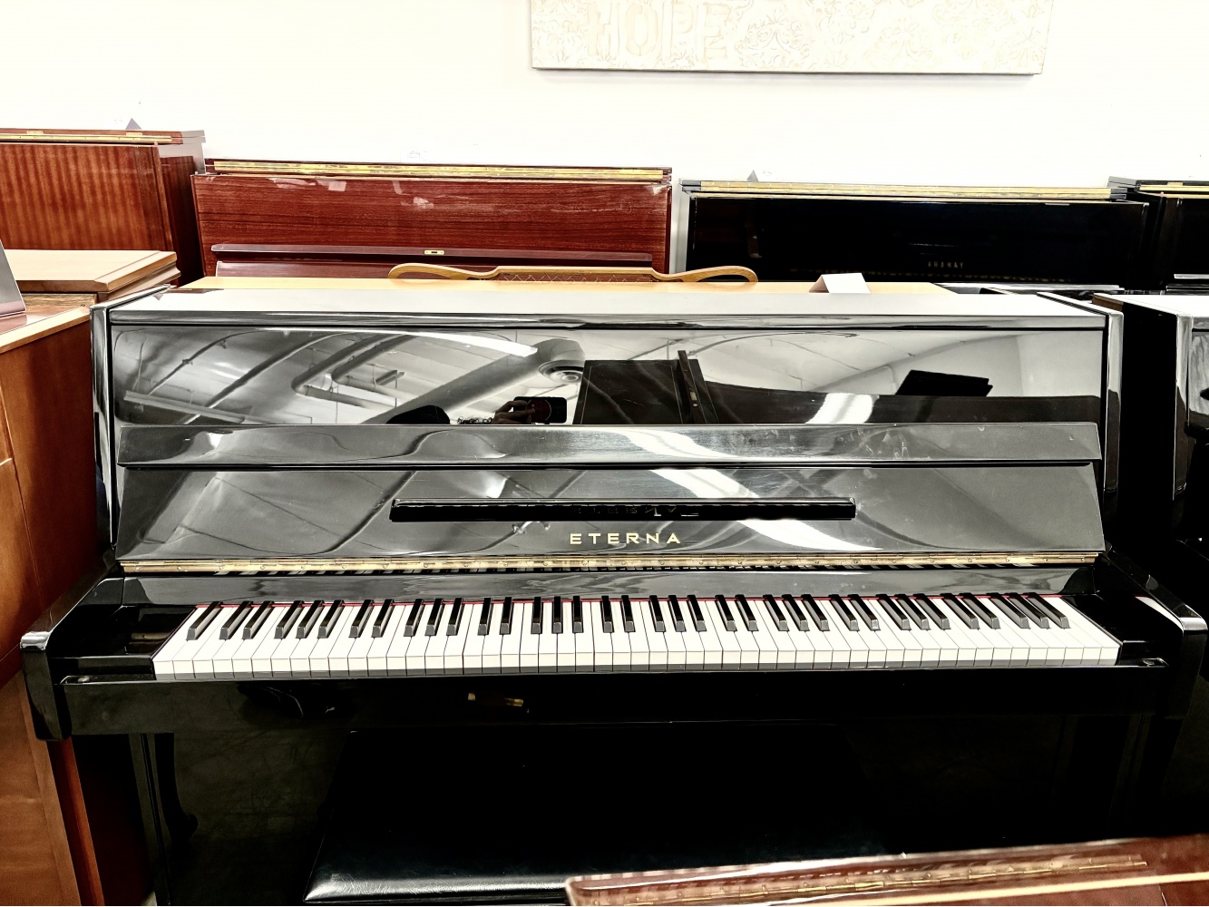 Gorgeous Eterna ER-C10 Console Upright Piano. This piano features a beautiful polished ebony finish. The console size is highly popular among musicians for its fuller tone and higher quality, while fitting very well in smaller homes and spaces. The legless continental design fits incredibly well in smaller homes and spaces. This piano is sure to look great in your home!