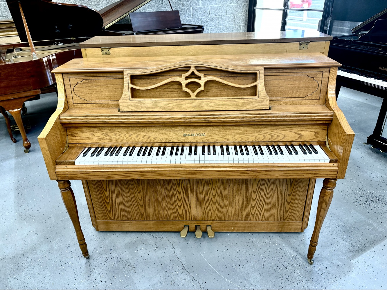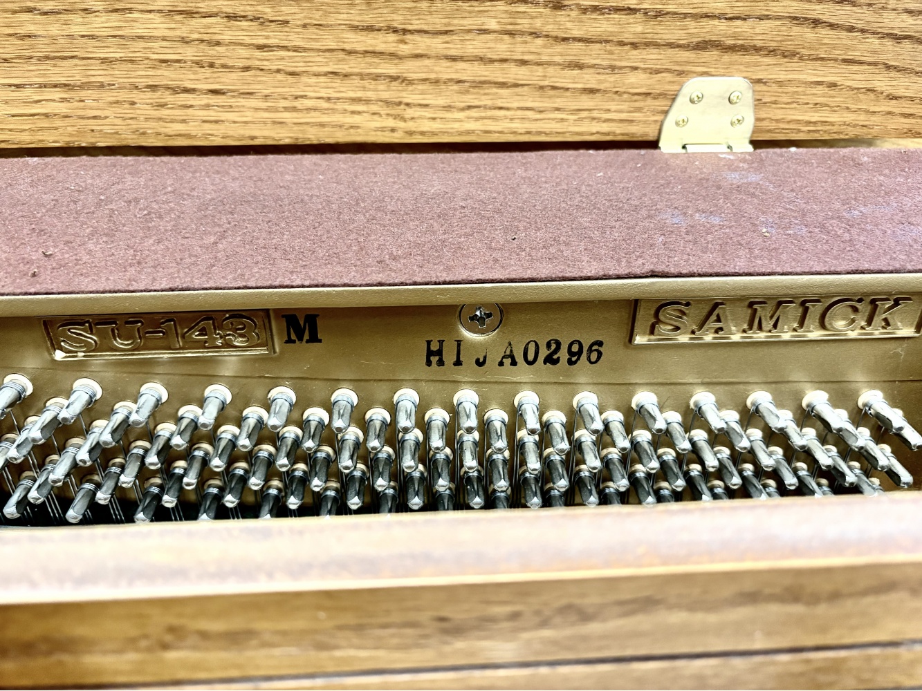 Beautiful Samick SU-143 Console Upright Piano. This piano features a gorgeous satin walnut finish and pentagonal style legs. It has a lovely brighter tone and excellent touch. The console style is highly-popular among musicians and homeowners for its compact size and excellent sound.